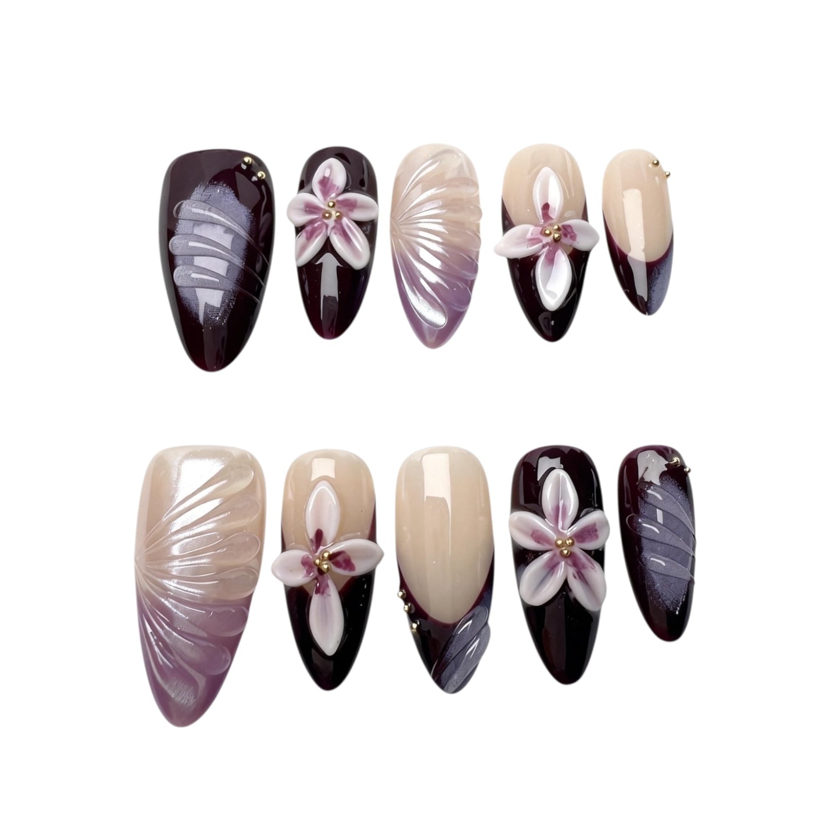 • Handcrafted press-on nails with sculpted 3D floral details